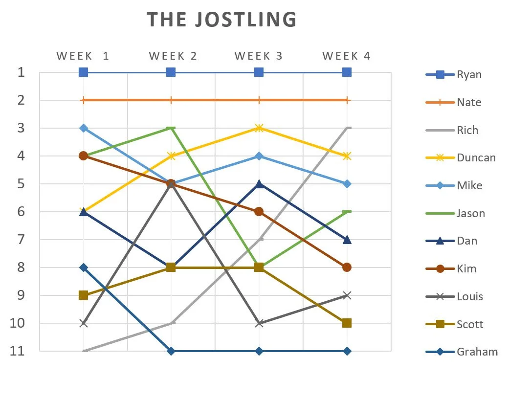Rich continues his rise from the ashes of Week 1 with his best week yet. He actually outpaces Ryan with both a 2nd & 3rd place song but gains only 1 point in the standings as Ryan has yet another strong week too. Jason also has a big week and bounces back up into the thick of the standings. In a very tight week, Nate, Duncan, Mike, Dan & Kim all hold fairly steady as the epic race for 2nd place continues!